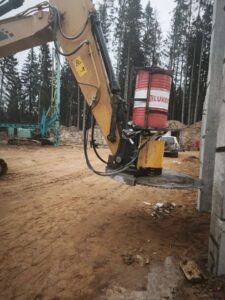 Тут понятно, что обычные мобильные электрические, ручные алмазные резчики не справятся с такой нагрузкой, также как и применять обычные сваерезки для распушения не имеет смысла. Такой производительности по резке забивных свай — этому оборудованию не достичь. Наша команда оперативно подобрала оптимальную модель пилы — выбор пал на Pilemaster RS05. При этом заказчик настаивал на том, что ему скорее всего понадобиться и более мощная модель Pilemaster RS10. В кратчайшие сроки на объект в городе Клин, была направлена наша пила, туда же выехал наш инженер для установки и подключения пилы на экскаватор Sany SY215. В процессе монтажа на экскаватор наш инженер установил пилу с поворотным адаптером, после чего принялся подключать гидравлическую часть и встретился с несколькими сложностями — вся диагностическая часть компьютера экскаватора была под паролем дилера экскаваторов Sany, поэтому настройка гидросистемы на стороне экскаватора была осложнена. Всю настройку решено было произвести путём регулировки гидравлического блока управления на стороне скальной пилы Pilemaster RS05. Настроив давление и максимальный поток был проведён холостой, пробный запуск оборудования. Только на следующий день была запланирована передислокация экскаватора на объект и начало резки свай. Забивных свай было действительно много!